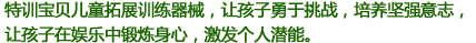 滄州華北特訓器械有限公司成立于2002年,是專業研發(fā)生產心理行為訓練器械、拓展器械、拓展器材、攀巖、兒童拓展器械的專業型企業,并通過ISO-9001質量管理體系認證及ISO-14001環(huán)境管理體系認證,致力于各職業群體提供的心理行為訓練器械、拓展器械、攀巖、兒童拓展器械等設備,使之不斷提升心理健康水平、充分開發(fā)自我潛能。我公司竭誠為廣大客戶提供專業化各類心理行為訓練器械相關產品和服務。